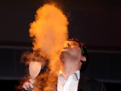 It was Michael Zdilla, assistant professor of chemistry, who demonstrated the Leidenfrost Effect by putting liquid nitrogen in his mouth during his talk on the uncertain path to renewable fuels. He’s OK; the vast difference in temperature between liquid nitrogen and Professor Zdilla’s tongue creates a momentary cushion of protective steam.
