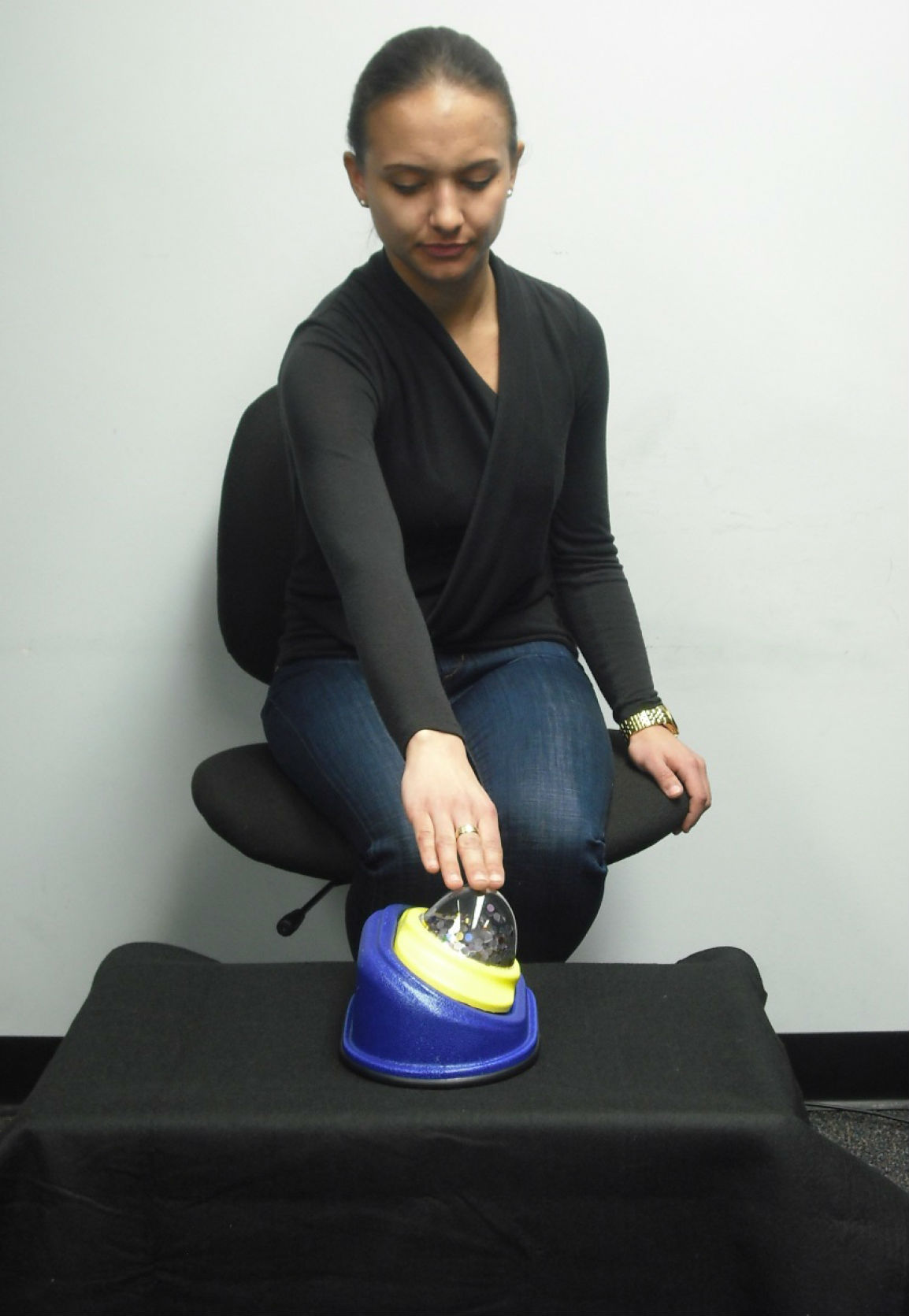 The toy had a clear plastic dome and was mounted on a sturdy base. When the experimenter pressed the dome with her hand or foot, music played and confetti in the dome spun. The experimenter repeated the action – taking breaks after every four presses – until the baby lost interest.