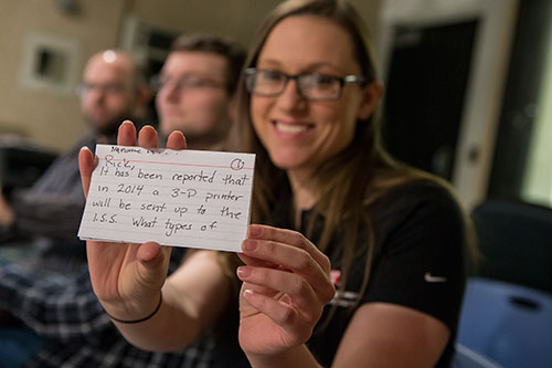 Caley Roberson, a senior mechanical engineering major, works with a 3-D printer in the College of Engineering and asked the astronauts about the one the ISS will have soon.