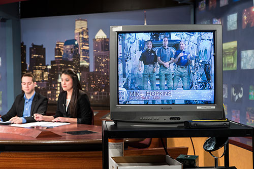 “It was the craziest thing I’ve ever done,” said junior media studies and production major Karina Cheung, who co-anchored the show with fellow media-studies major Nick Lucier, a senior. “To actually talk to people in space, just floating there and passing the mic—which was floating through the air—was an amazing experience.”