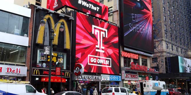 An example could be seen practically across the street from Madison Square Garden. A digital billboard displayed a huge Temple T and the #WeTheT hashtag.
