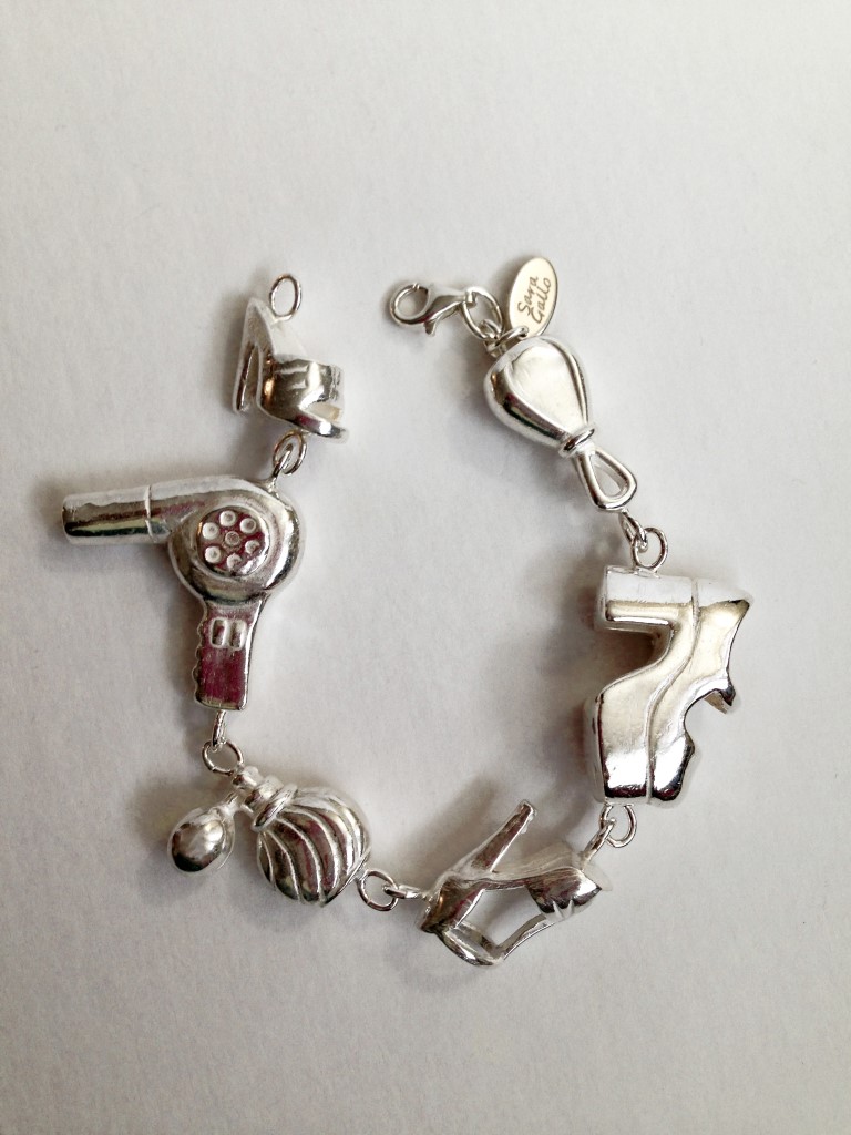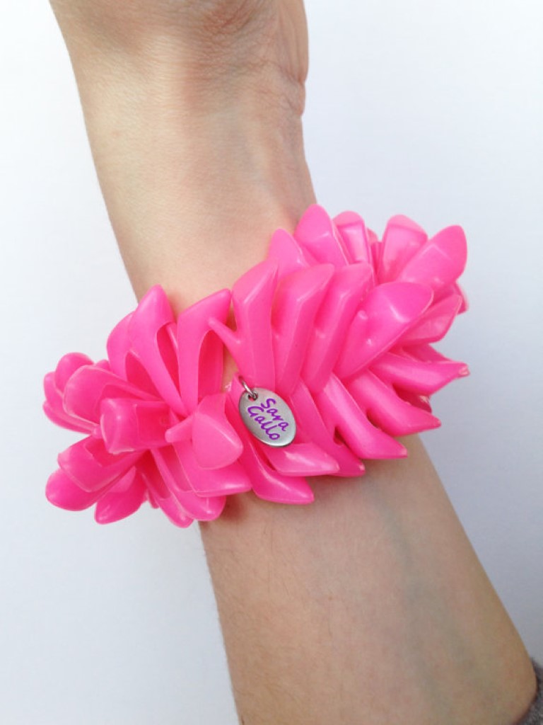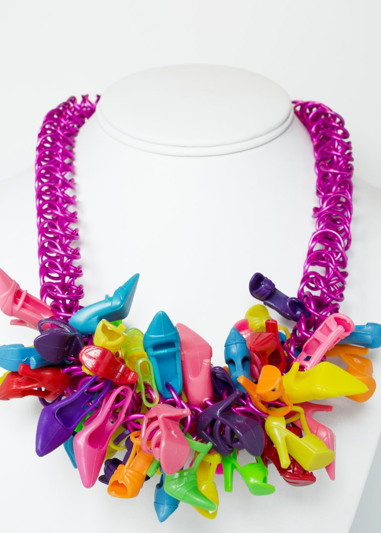 Especially popular is Gallo’s Barbie shoe jewelry series: necklaces, bracelets and earrings adorned with colorful, plastic Barbie doll shoes.
