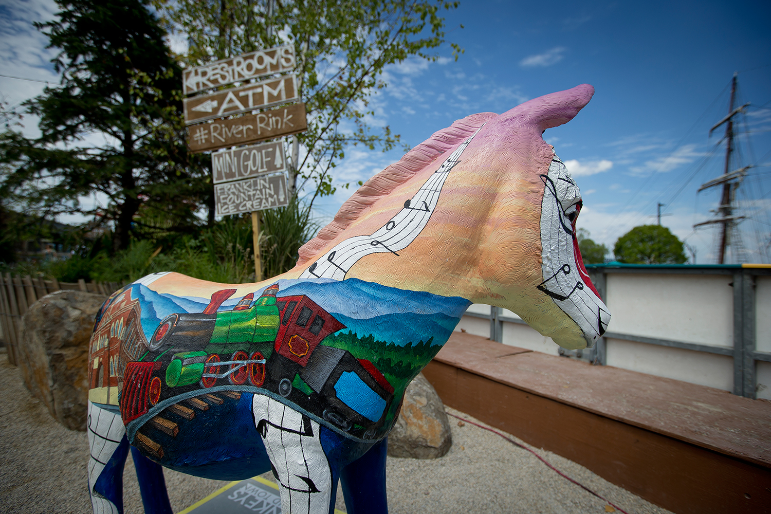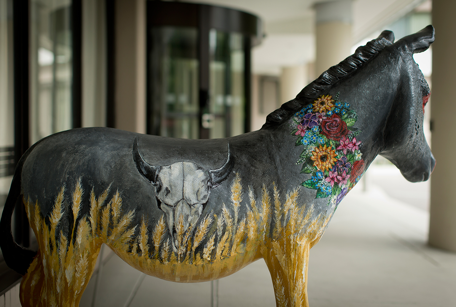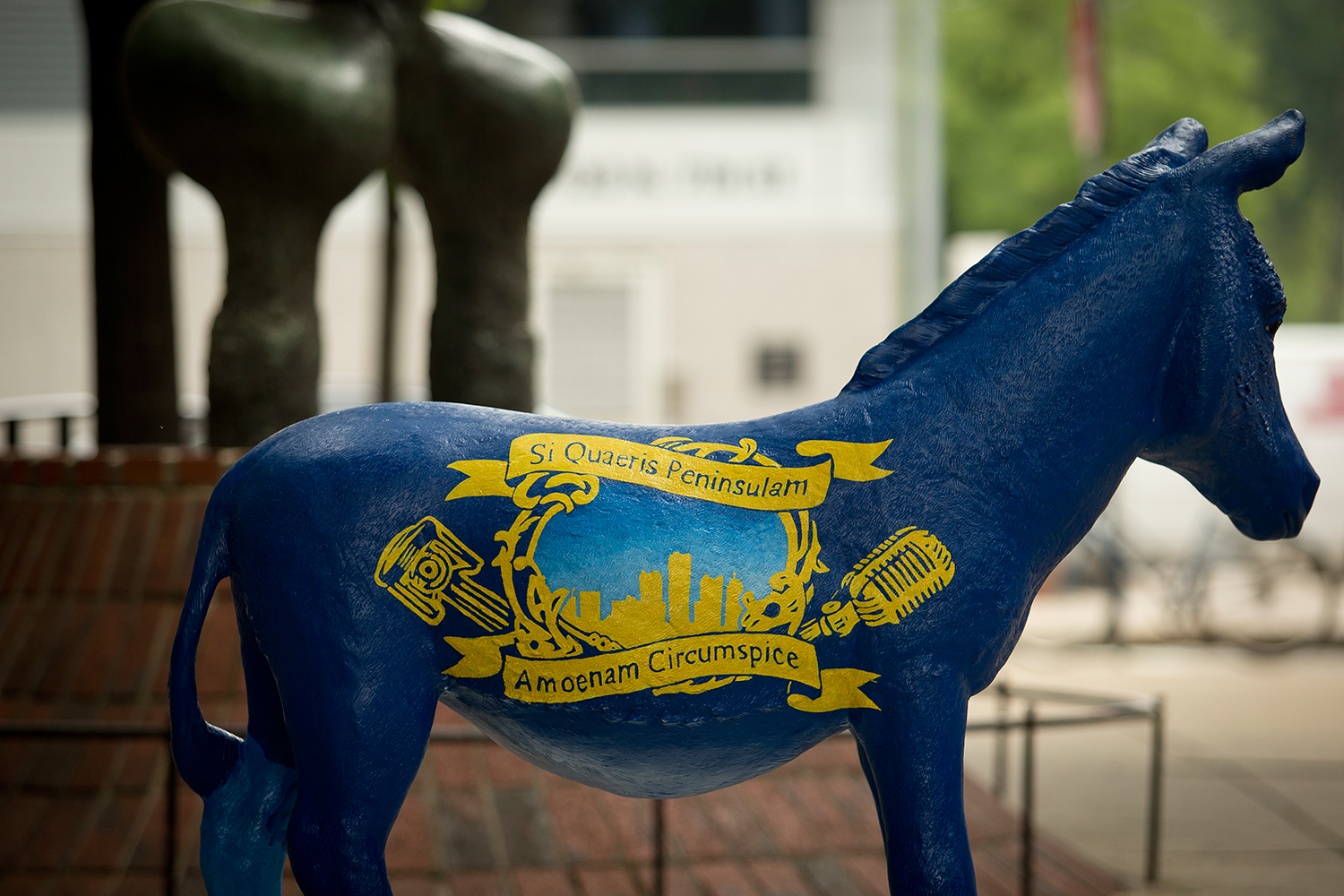 Each artistic Owl—Brad Carney, TYL ’02; Brian Cesario, TYL ’78; Colleen McCubbin Stepanic, TYL ’03; Ellen Tiberino, EDU ’05; and Joy Waldinger, TYL ’15—applied to be one of the 30 artists selected for the installation. They were each assigned two states or territories and worked with those delegations to develop design concepts for their donkeys. The delegates gave artists a list of six elements that represent the state or territory, and the artist chose between three and six to be reflected on the donkey.
